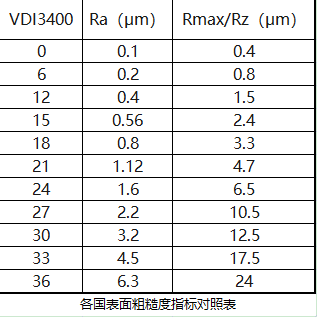 上圖是歐美國家VDI3400指標、國內Ra指標和日本Rz指標的對照表。有需要的朋友可以直接下載保存。